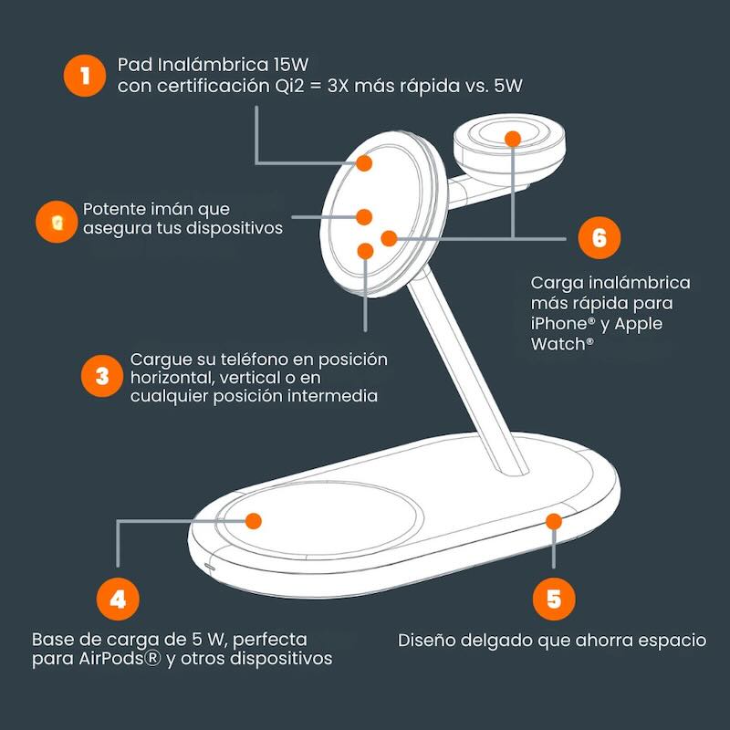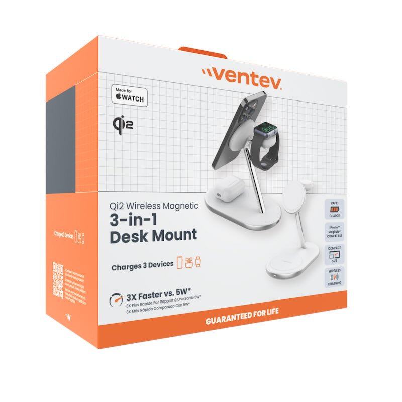 El soporte inalámbrico Magnético 3-1 de Ventev es la solución de carga esencial para los clientes de iPhone. Perfecto para tu espacio de trabajo desde casa, mesa de noche y más para cargar todo el ecosistema móvil de Apple. El diseño que ahorra espacio apila perfectamente su iPhone, Apple Watch y Airpods. Cargue su teléfono en posición horizontal, vertical o en cualquier lugar intermedio para usar su teléfono como necesite mientras lo carga con la ultima tecnología Qi2.