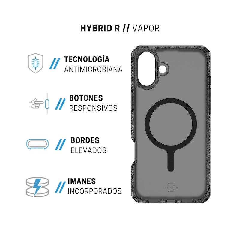 Hybrid R Vapor es compatible con MagSafe. Esta funda delgada y esmerilada cuenta con una tapa dura mate sutil y un perímetro brillante que te permite mostrar el diseño de tu teléfono. La superficie antihuellas hace que tu funda luzca hermosa.