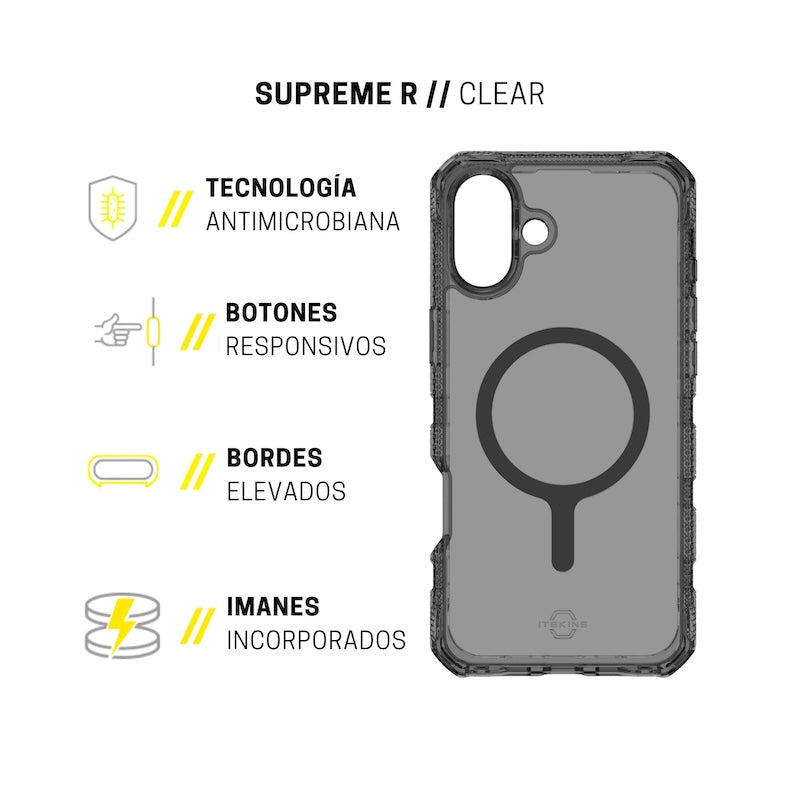 Supreme R Clear te brinda protección extrema contra impactos y caídas con una superficie autorreparable y compatible con MagSafe. Los detalles antideslizantes agregan agarre adicional a los lados y evitan que tu dispositivo se te escape de la mano. Fabricada con materiales 100% reciclados.