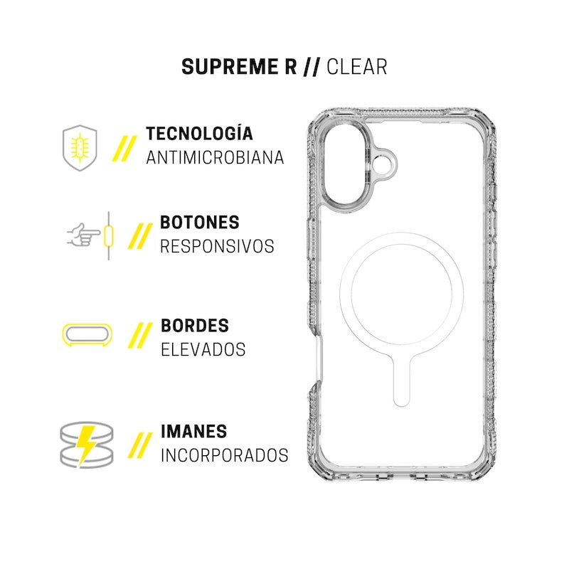 Supreme R Clear te brinda protección extrema contra impactos y caídas con una superficie autorreparable y compatible con MagSafe. Los detalles antideslizantes agregan agarre adicional a los lados y evitan que tu dispositivo se te escape de la mano. Fabricada con materiales 100% reciclados.