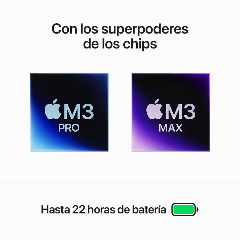 MEMORIA UNIFICADA Y ALMACENAMIENTO VELOCES — Hasta 36 GB (chip M3 Pro) o hasta 128 GB (chip M3 Max) de memoria unificada para que todo sea rápido y fluido. Almacenamiento SSD superrápido de hasta 4 TB (M3 Pro) o hasta 8 TB (M3 Max) para abrir apps y archivos al instante.