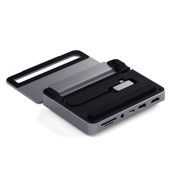 Supere los límites de una configuración tradicional con el soporte y concentrador de aluminio Satechi para iPad Pro, que combina todas las capacidades de una computadora de escritorio con la comodidad de una tableta. Diseñado para Apple iPad Pro (2018 y posteriores), el soporte cuenta con HDMI 4K (60 Hz), carga PD USB-C, datos USB-A, lectores de tarjetas SD y un puerto de conector de audio, para un fácil acceso a los periféricos mientras eleva su iPad Pro. Con su conveniente diseño plegable y su moderno acabado de aluminio, el soporte es perfecto para cualquier lugar donde trabaje, sin necesidad de una computadora de escritorio.